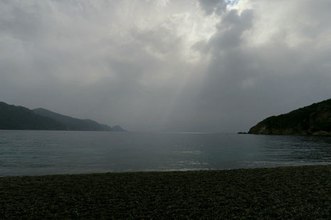 Das Wetter wurde im Tagesverlauf immer seltsamer. Die Sonne verdichtete ihren Schleier mit dunklen Wolken, aus denen es intermittierend tröpfelte. Mehr nicht. Es war schwierig, unsere persistierende Faulheit davon zu überzeugen, nicht mehr so zu klammern. Beleidigt zog sie einen Flunsch und verdrückte sich leise weinend, so dass wir uns auf den Weg zum Strand machen konnten. Es tröpfelte heftiger, so dass ich zu bedenken gab, dass wir vor dem Baden nass werden könnten. Ines ließ sich davon nicht beeindrucken und so enterten wir die dunkeldunstige Bucht. Bleiern plätscherte das Mittelmeer vor sich hin, als ich nahezu ohne Bedenken angesichts seiner Temperaturen ins Wasser rann.... ähm schlich. Saukalt war das!!! Ines plätscherte kichernd im bestenfalls 9 Grad kalten Wasser, während mein innerer Schweinehund vor hochfieberhaften Pneumonien warnte. Tapfer schlotternd schritt ich meinem Verhängnis entgegen. Es wurde schnell tiefer. Meine Unterschenkel hatten schon Gefrierbrand, als ich mich beherzt in die Fluten stürzte. Nach dem ersten Schreck war das richtig, richtig toll und so ließ ich mich auf dem Rücken liegend vom Mittelmeer verschaukeln.